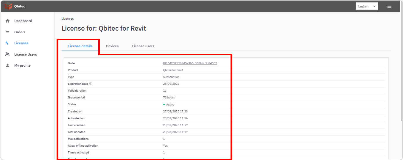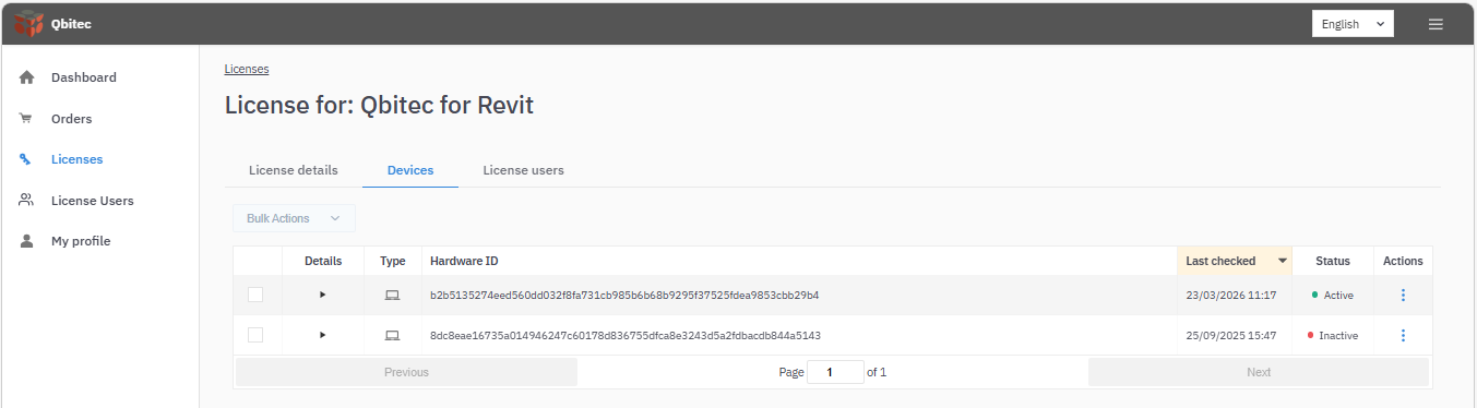 The Devices section provides an overview of all devices for which the license has been activated, as well as the current activation status.