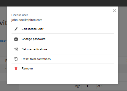From the Actions menu, you can change the email address or password for the license user, or remove the user to make room for others. You can also reset the total activations for that user, which deactivates their license on any device. You can set the maximum number of activations to allow the user to activate the license on multiple devices, as long as the total number of activations for the license is not exceeded (see License Details).