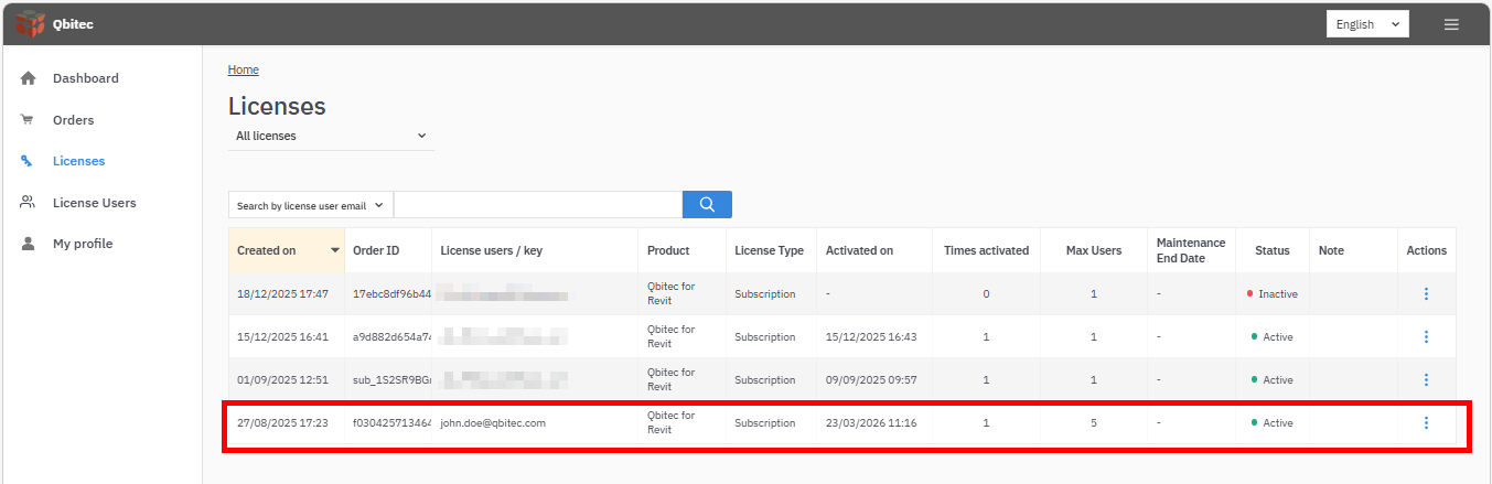 The Licenses section provides an overview of all the licenses associated with your user account. Click on a row in the list to manage a particular license.