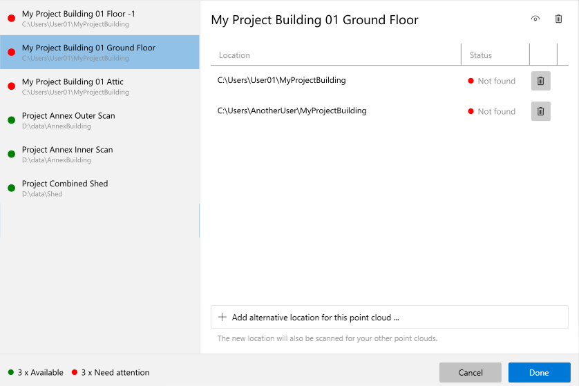 This allows multiple users or machines to work with the same project even if point clouds are stored in different locations or require individual credentials to a remote source.